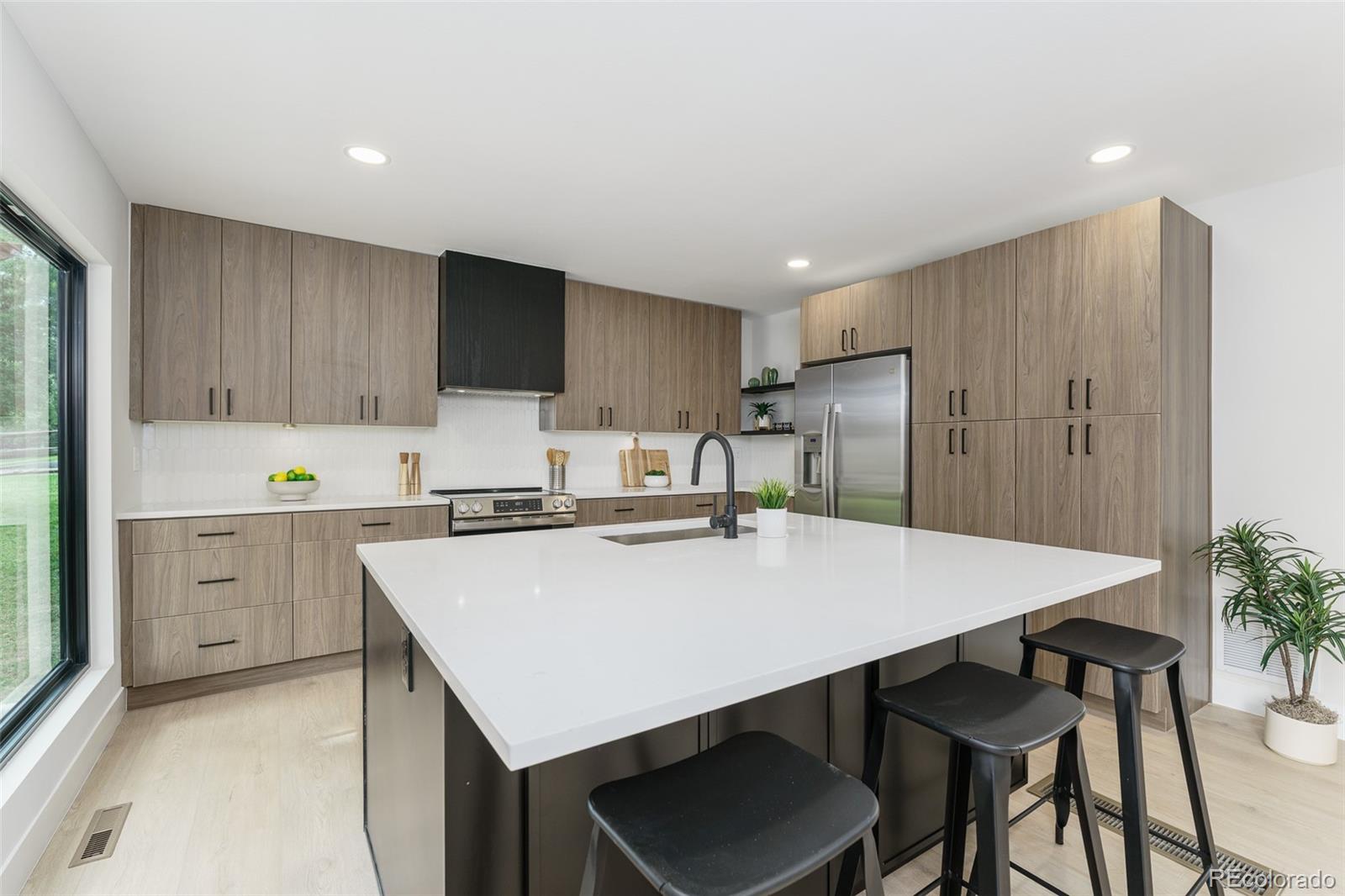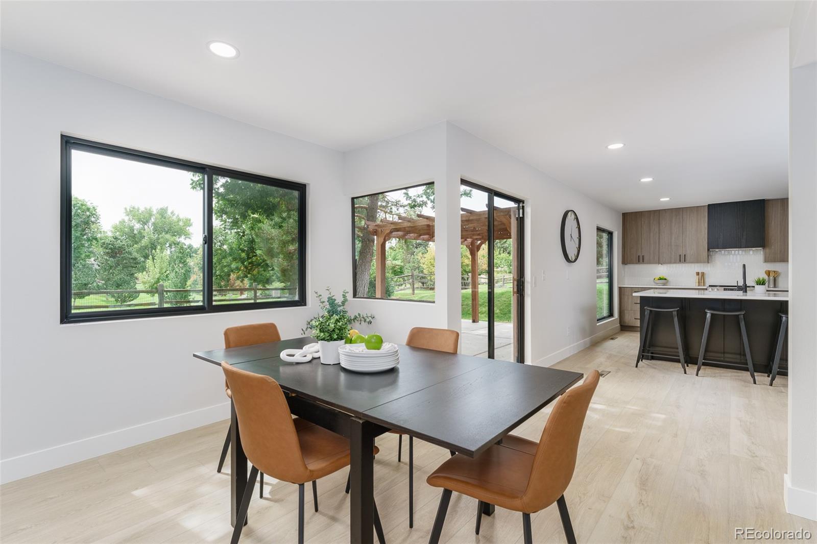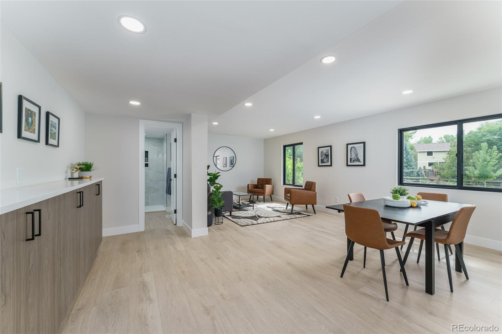 Not your granny's house! This sleek, modern, updated Brookdale sits on a fabulous greenbelt at the end of a cul-de-sac in the heart of Willow Creek I. With vaulted ceilings in the entry and formal living room, natural light pours in from every angle. The modern Euro-style cabinets, open shelving and generous island make the kitchen a joy to work in. Form meets function with new appliances and generous storage. The open lower area has multiple windows to take in the fabulous views, and the large deck has plenty of room for entertaining. The primary suite has an updated bath with a walk in shower, large double vanity and a generous closet. There are two additional bedrooms upstairs and a full second bathroom. A bonus room in the basement could function as a guest room, playroom, media room or office. New Anderson windows, new furnace and a third bathroom complete the package. A short walk through a fabulous greenbelt immediately outside the back fence leads to tennis courts, a pool, playground and a clubhouse reserved for residents only. Park Meadows mall is minutes away with multiple dining and shopping opportunities. Easy access to I-25 and C470. Convenient to the tech center. Award-winning Willow Creek Elementary feeds into either West or Campus Middle School and Cherry Creek High School.